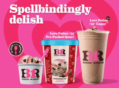 Baskin-Robbins wants you to celebrate Valentine’s Day with not one, but two saccharine desserts. The first is its flavor of the month, Love Potion #31, which combines white chocolate and raspberry flavored ice creams blended with raspberry-filled chocolate-flavored hearts, raspberry swirls, and chocolate chips. It’s available in cups, pints, and as a Cappy coffee made from Arabica coffee beans and drizzled with fudge.