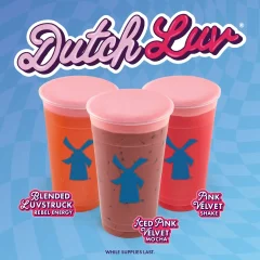 Luvstruck Rebel – Blackberry and vanilla mixed with the signature Dutch Bros Rebel energy drink, swirled with a layer of pink velvet frosting Soft Top. It can be blended with lemonade, too.