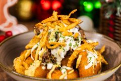 DESCRIPTION: Topped with pot roast, beer-cheese sauce, crispy onions, and horseradish mustard (Available during Mickey’s Very Merry Christmas Party only).