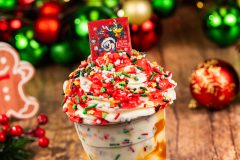 DESCRIPTION: Vanilla Shake topped with whipped cream, festive sprinkles, apple-caramel sauce, cherry coating, and a chocolate piece (Non-alcoholic) (Available during Mickey’s Very Merry Christmas Party only).