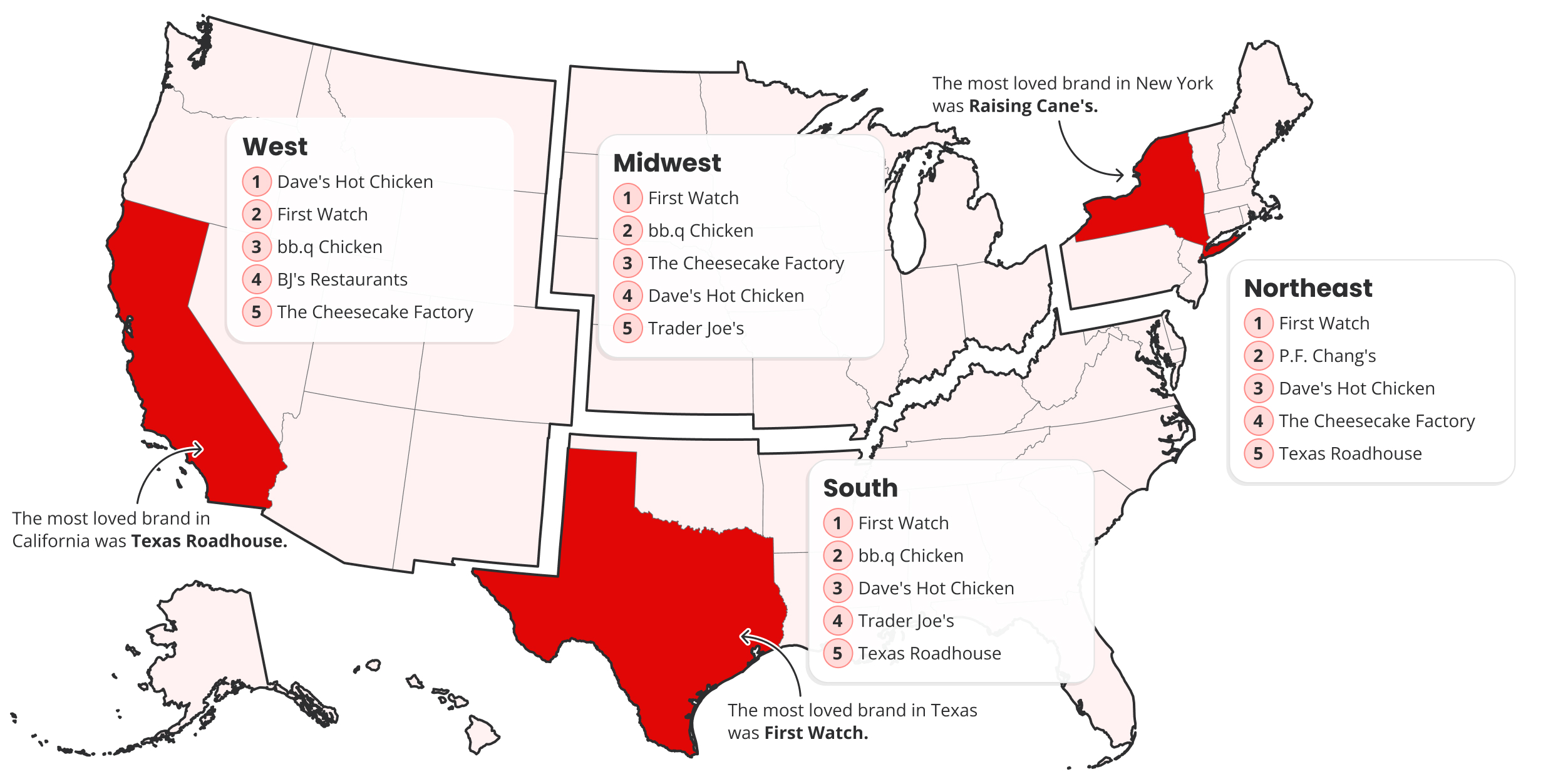 The study also analyzed review sentiment for several popular topics across each brand, like food quality, taste, value, portion size, service, speed of service, wait experience, and cleanliness. In the end, Dave’s Hot Chicken, bb.q Chicken, and First Watch are the most loved brands in each region, while Texas Roadhouse and Cheesecake Factory are the most loved brands by each state.