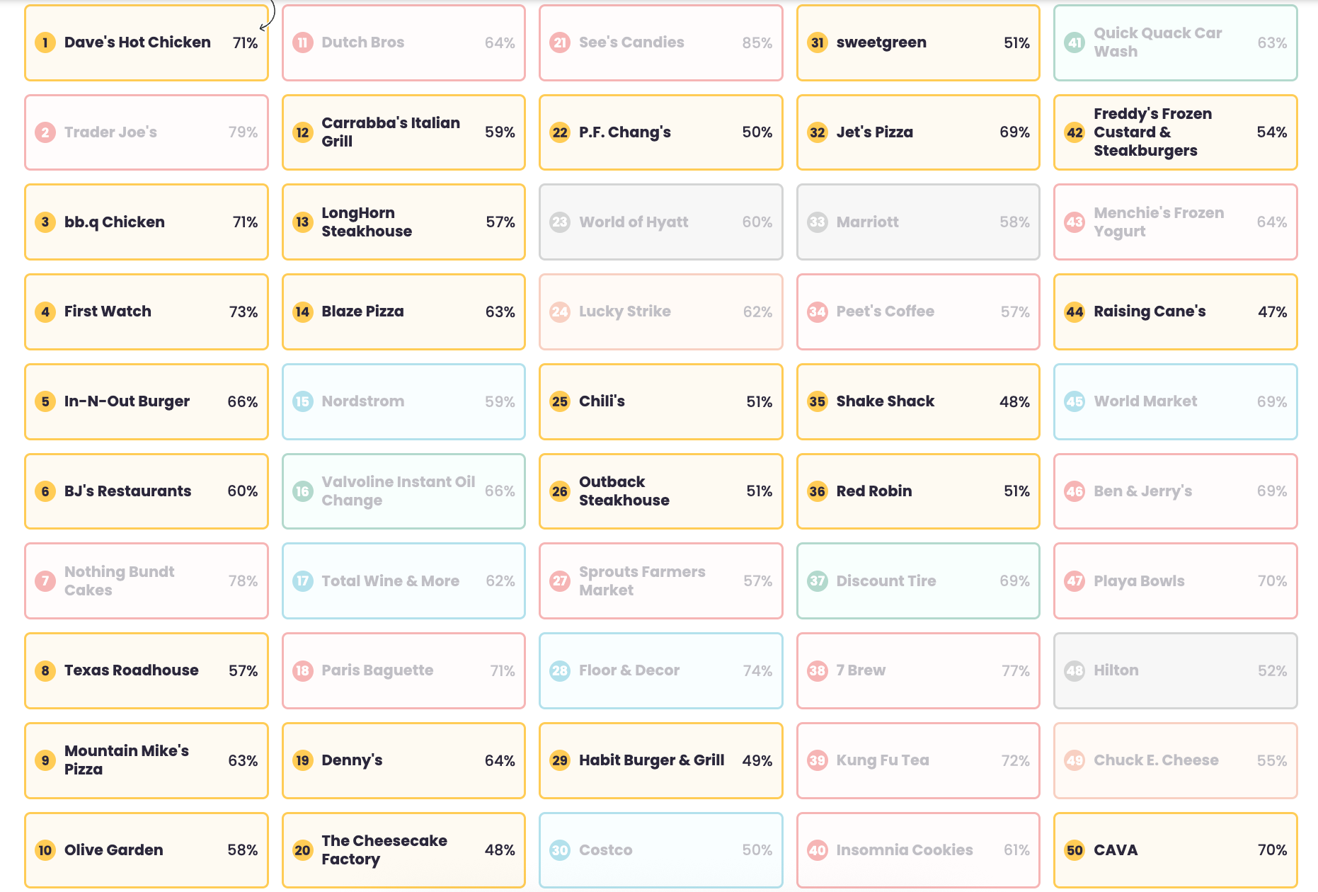 In addition to being named Yelp’s 2025 Most Loved Brand, it also landed at number two on Yelp’s 2025 Top Chicken Sandwich Chains list and number 28 on its 2025 Fastest Growing Brands list. According to Yelp’s data, 71% of Dave’s Hot Chicken reviews are 4 or 5 stars, which is one of the highest review distributions of any brand this year.