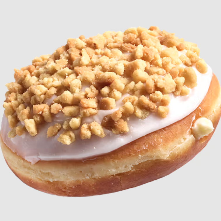 A shell doughnut stuffed with Biscoff cookie butter Kreme dunked in Biscoff Cookie Butter icing, and drizzled with vanilla icing, then topped with Biscoff cookie crumble