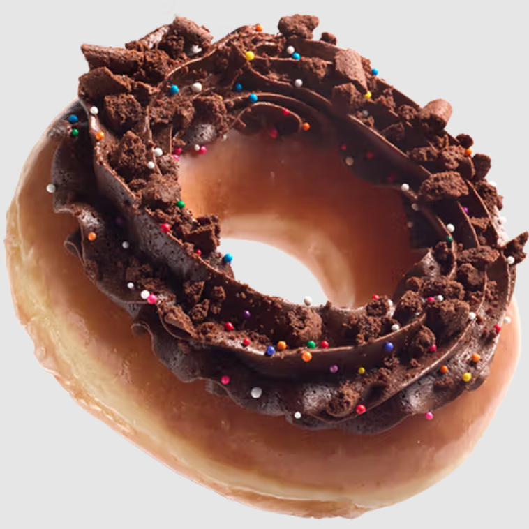 The signature Original Glazed doughnut dressed with brownie batter-flavored buttercream and sprinkled with brownie crumbles and rainbow sprinkles.